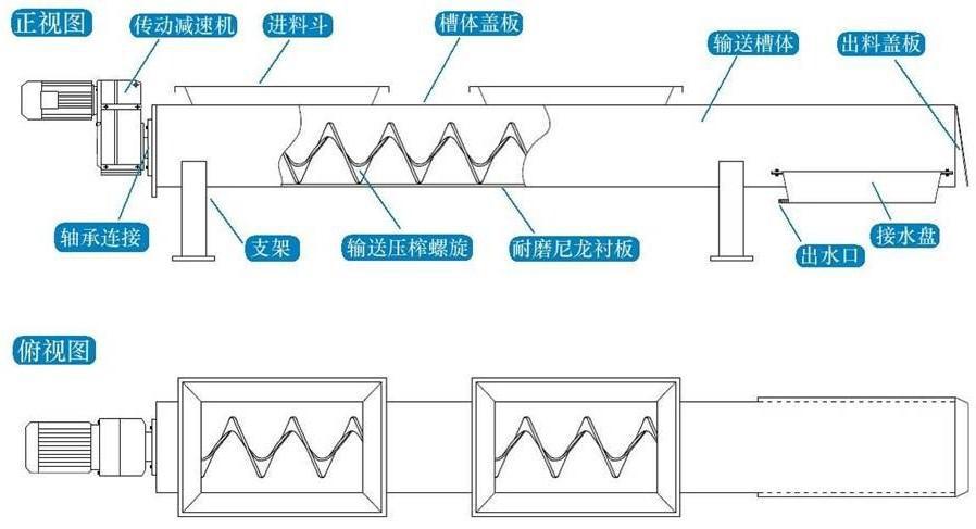 该压榨机输送压榨壳体采用U型槽式结构,上部封盖板,为增加出料高度,一般为平送出料。 压榨螺旋采用无轴螺旋,下衬耐磨尼龙衬板,增加了输送长度,压榨部分为平送压榨结构。 可同时接受多台格栅出料,输送加压榨一体,减少了动力消耗及设备投资。